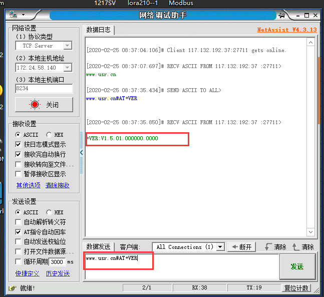 4. 連接成功后,可以從服務器端發(fā)送網絡AT指令來查詢/設置DTU的參數