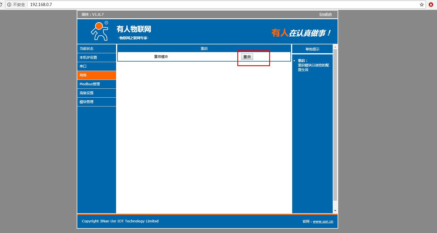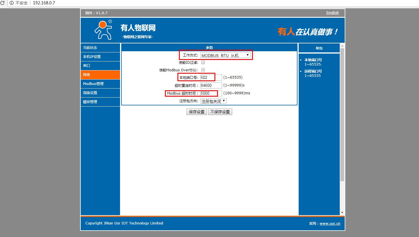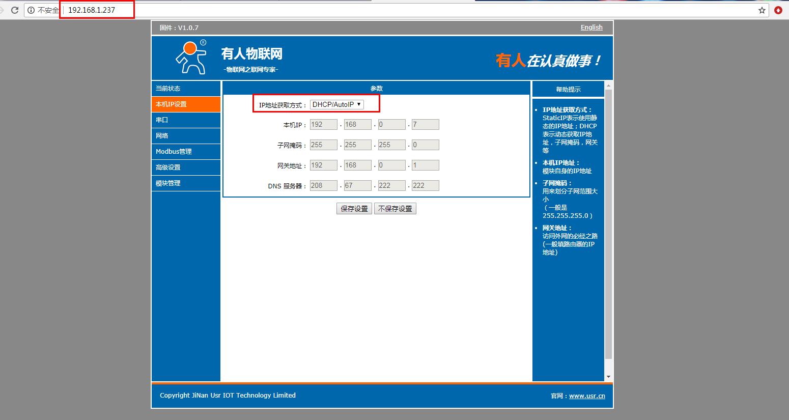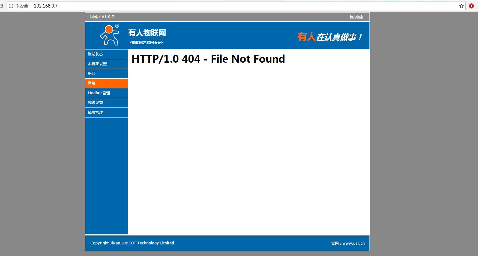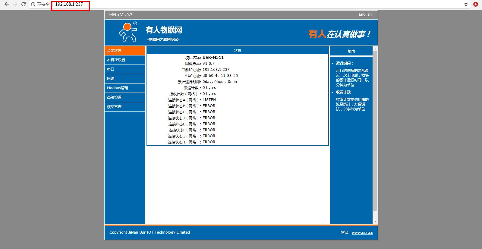 在電腦打開瀏覽器,輸入靜態(tài)IP192.168.0.7 登錄USR-M511的內(nèi)置網(wǎng)頁。