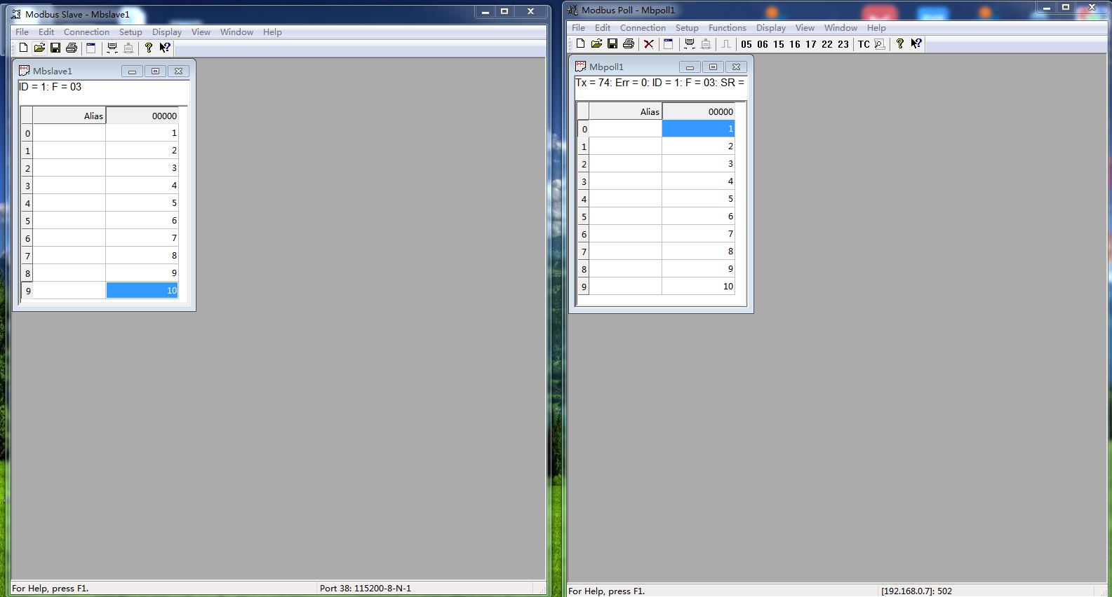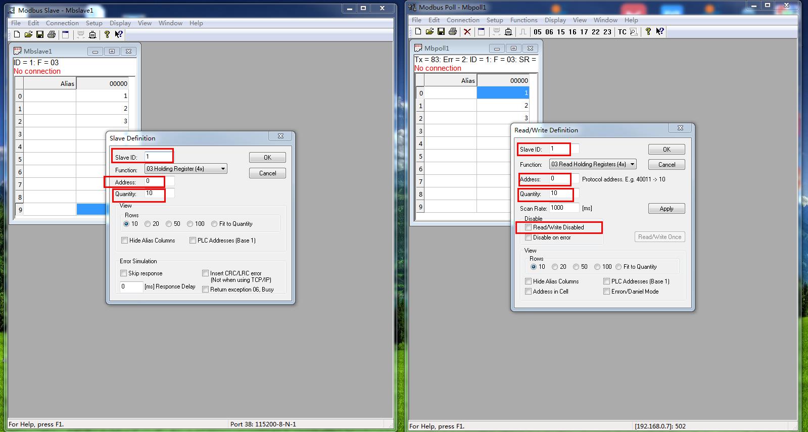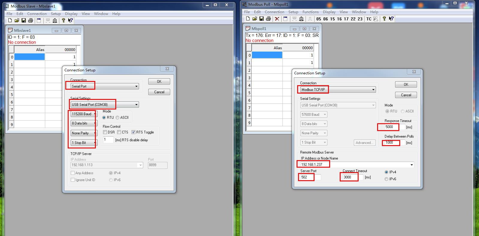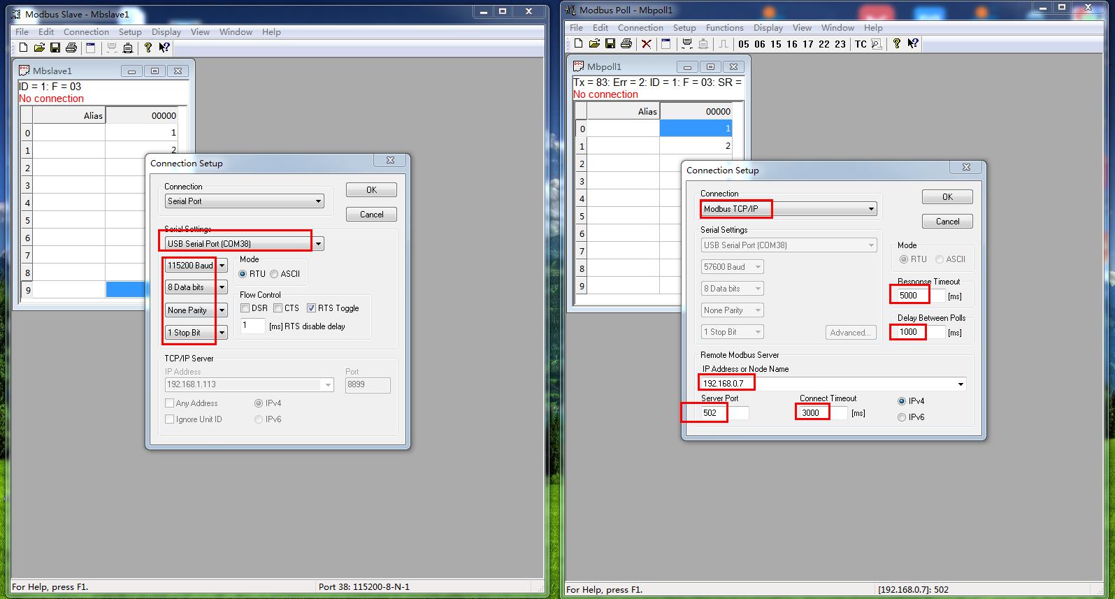 模擬測試用MODBUS SLAVE軟件做串口設(shè)備,用MODBUS POLL軟件做網(wǎng)絡(luò)端。