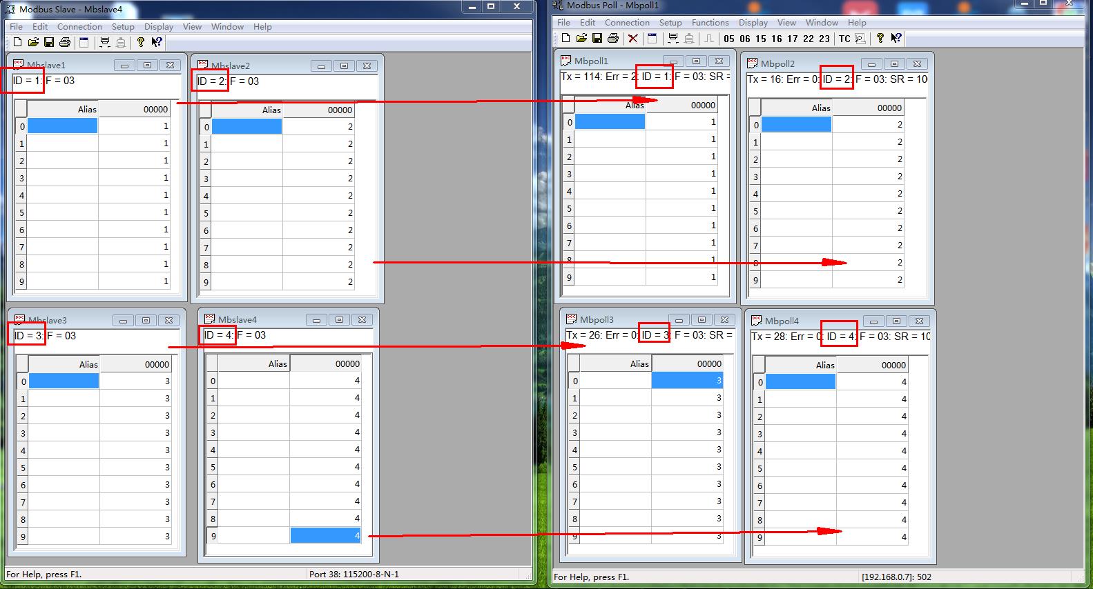 改變每個MODBUS SLAVE軟件的數(shù)據(jù),對應(yīng)的MODBUS POLL軟件就可以采集到正確的數(shù)據(jù)。