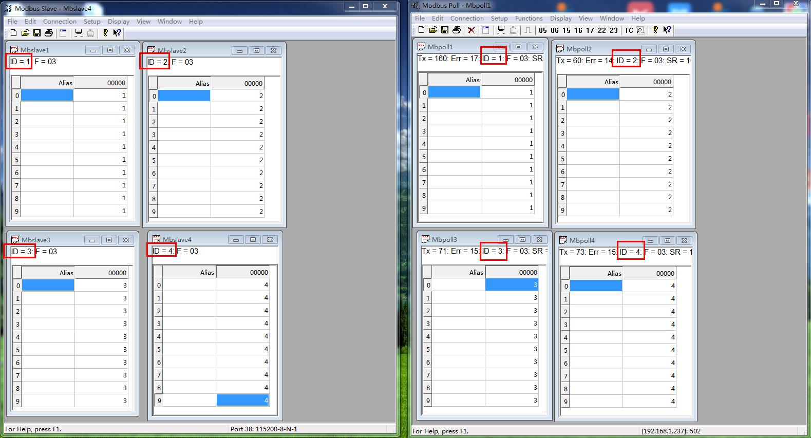 MODBUS POLL軟件對應(yīng)添加4個SLAVE ID,依次是ID 1 ID 2 ID 3 ID 4。