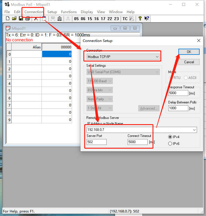 點(diǎn)擊connection--connect,connection選擇Modbus TCP/IP,IP地址填USR-M511的IP地址,Server Port填USR-M511的端口號502。注意MODBUS POLL軟件的3個時間參數(shù),依次是