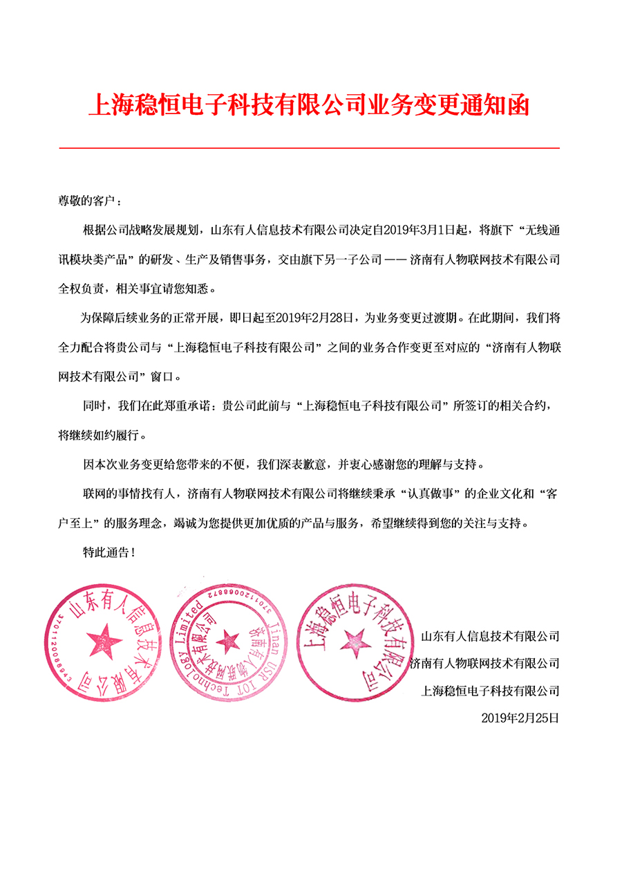 有人科技子公司上海穩(wěn)恒電子科技業(yè)務(wù)變更通知函