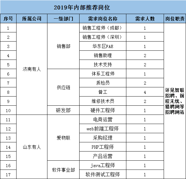 有人物聯(lián)網(wǎng)開(kāi)啟新年招聘計(jì)劃,有需要的童鞋可關(guān)注公眾號(hào)“有人物聯(lián)網(wǎng)”,或前往智聯(lián)、無(wú)憂、獵聘等招聘網(wǎng)站了解詳情。