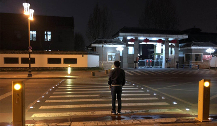 “路口危險,請注意來往車輛!”當行人站在斑馬線路口時,兩邊的黃色紅外檢測設備便發(fā)出這樣的語音提示,發(fā)光道釘也會瞬間亮起。