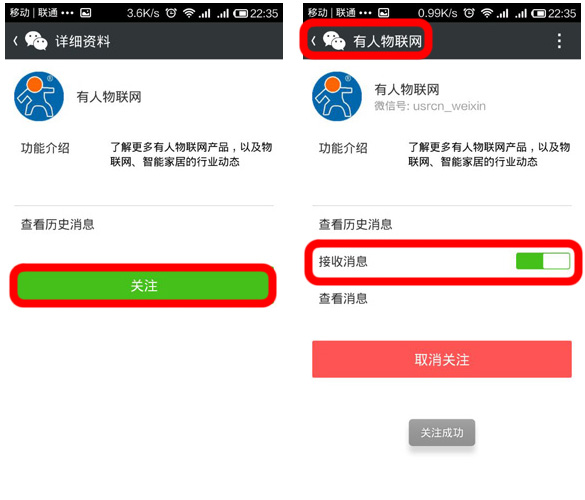 點(diǎn)擊“關(guān)注”,關(guān)注成功之后,確定“接收消息”為開啟,然后點(diǎn)擊“查看歷史消息”或左上角返回。