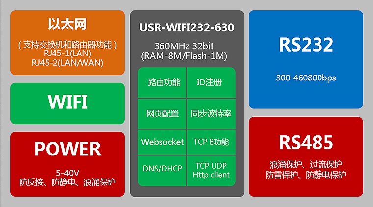 630網(wǎng)絡(luò)功能接口支持“WIFI”和“雙以太網(wǎng)口”,雙網(wǎng)口支持路由功能,串口功能接口支持“RS232”和“RS485”任意選擇一種(但不支持同時使用)。630不僅可以實(shí)現(xiàn)232/485轉(zhuǎn)WIFI、232/485轉(zhuǎn)以太網(wǎng),甚至可以實(shí)現(xiàn)以太網(wǎng)與WIFI的雙向數(shù)據(jù)透傳。