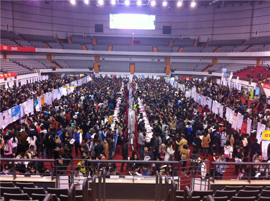 2016年3月26日,山東省濟(jì)南市,山東大學(xué)中心校區(qū)體育館內(nèi)舉行畢業(yè)生招聘會(huì),673家用人單位提供萬(wàn)余個(gè)就業(yè)崗位,吸引了1萬(wàn)多名畢業(yè)生前來(lái)尋找工作。