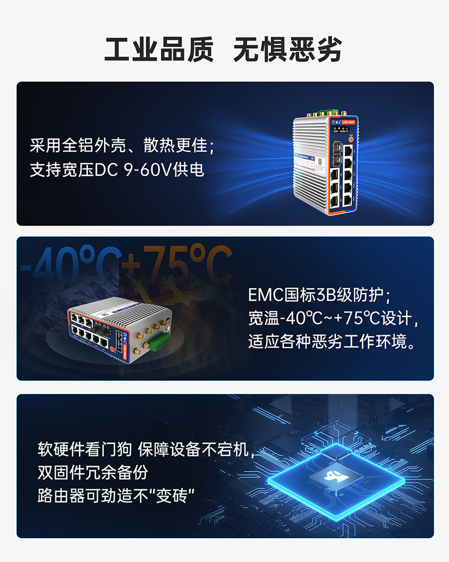 某智能制造企業(yè)部署了200臺(tái)普通商用路由器連接生產(chǎn)線PLC,因缺乏“三防”設(shè)計(jì),每年因雷擊、浪涌、ESD導(dǎo)致的故障率高達(dá)15%,運(yùn)維成本超50萬元。改用滿足IEC 61000-4-5 Level 3、IEC 61000-4-2 15kV標(biāo)準(zhǔn)的工業(yè)路由器(如G806w)后,故障率降至2%以下,運(yùn)維成本降低80%。