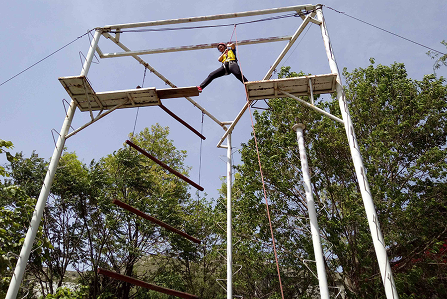 在距離地面8米的高空搭起了一座獨(dú)木橋,橋的中間斷開1.2米-1.4米。要求隊(duì)員爬上8米的高空后,從一側(cè)邁到另一側(cè),再從另一側(cè)邁回來,隊(duì)員要完成兩次跨越...