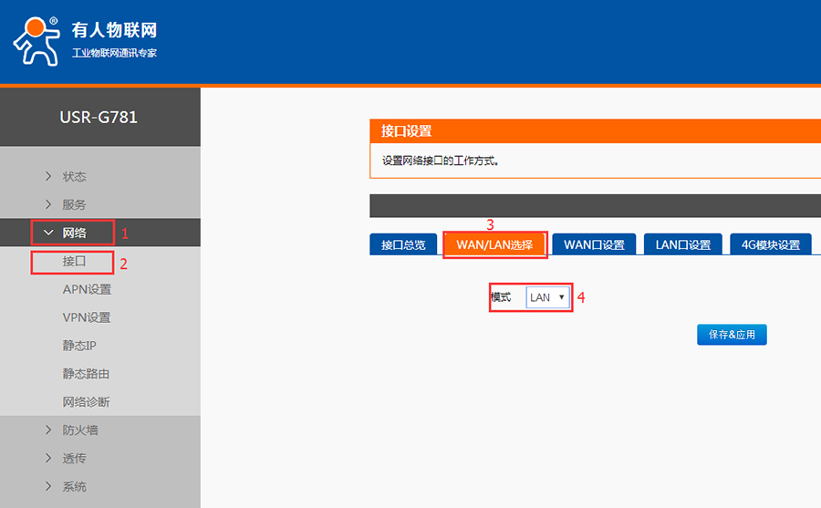 這種方式進(jìn)行組網(wǎng)網(wǎng)時只需要進(jìn)行一步設(shè)置即可達(dá)到該組網(wǎng)的要求,只需要在內(nèi)置網(wǎng)頁中將網(wǎng)口的WAN口工作模式改成LAN口,具體頁面請參照上圖。