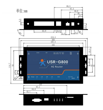 第二,USR-G800的外觀尺寸如下圖,產(chǎn)品邊緣有掛耳,根據(jù)具體安裝環(huán)境,適當使用。