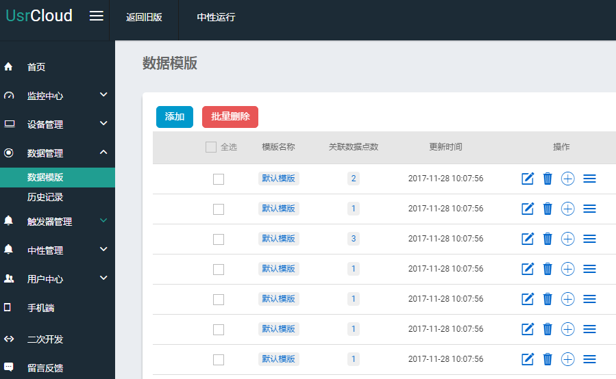 把數(shù)據(jù)點(diǎn)放到模板里,添加設(shè)備的時(shí)候只要關(guān)聯(lián)模板就行了,不用再編輯每個(gè)數(shù)據(jù)點(diǎn)了。(由于之前的版本有幾百個(gè)數(shù)據(jù)點(diǎn),每次添加設(shè)備都需要編輯一遍,用戶表示比較累,因此透傳云升級(jí)版本時(shí)做了人性化處理)。