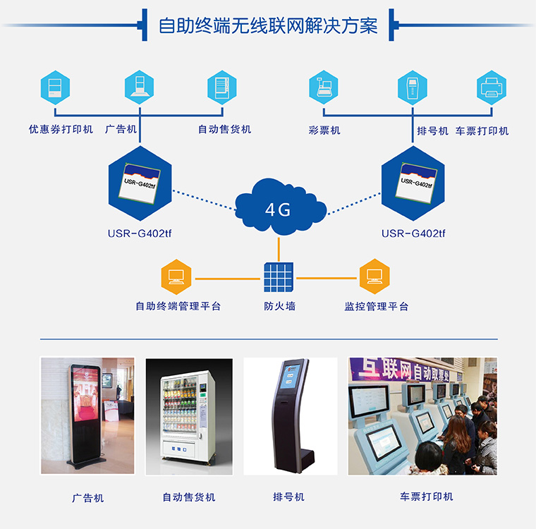 自助終端設備需要大數(shù)據(jù)量網(wǎng)絡傳輸,通過4G模塊高速聯(lián)網(wǎng),將所有終端業(yè)務數(shù)據(jù)及設備運行狀態(tài)實時傳輸?shù)綐I(yè)務中心,降低了業(yè)務中心運營成本,管理運營規(guī)?;?。