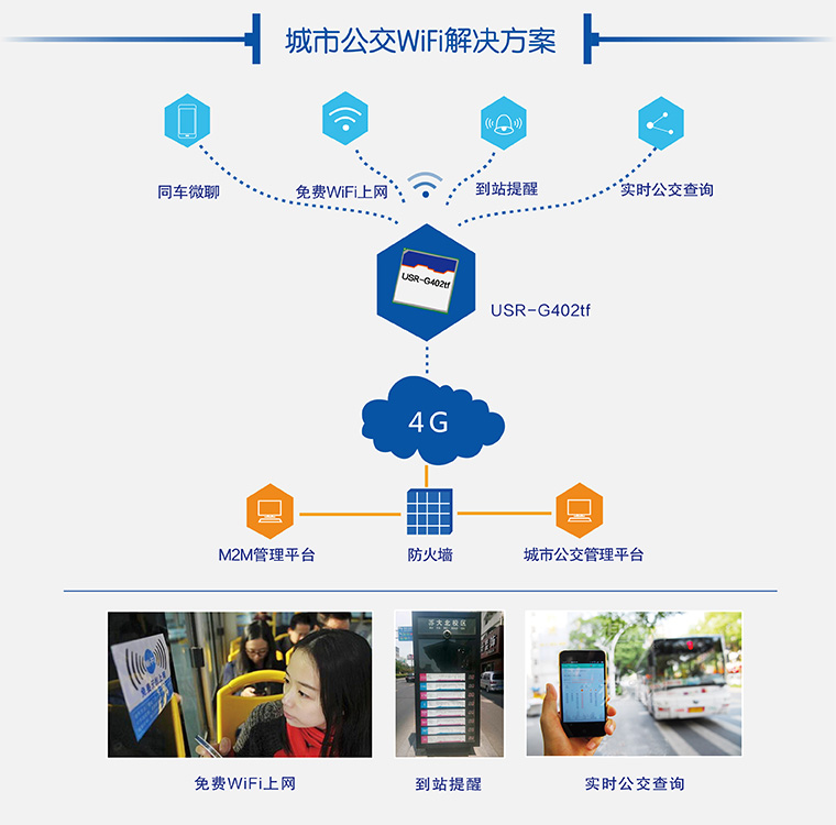 利用4G模塊聯(lián)網(wǎng)使公交車完全智能化,讓乘客輕松實現(xiàn)wifi聯(lián)網(wǎng),隨時查詢公交出行到站信息,節(jié)約乘客時間,方便出行,更好的提升城市形象。