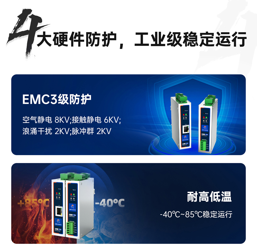 電源回路差模1KV,共模2KV;CAN回路共模2KV;串口回路共模2KV;網(wǎng)口回路共模2KV